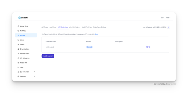Select your LLM provider, enter your API Key and click "Add Credential"
